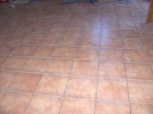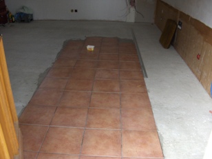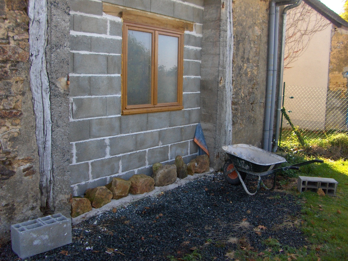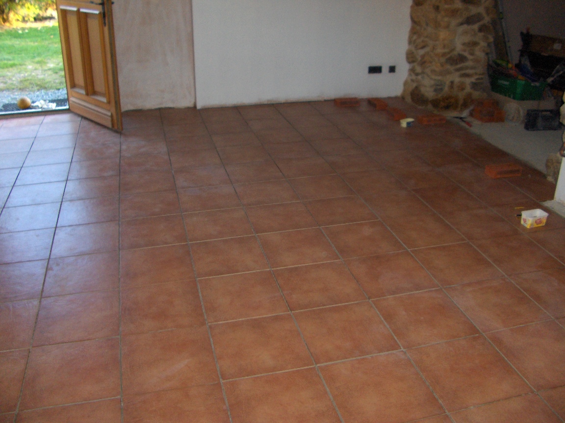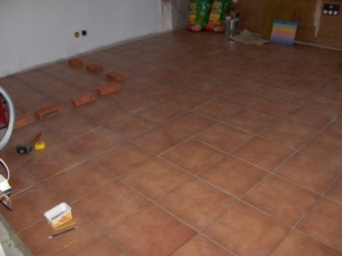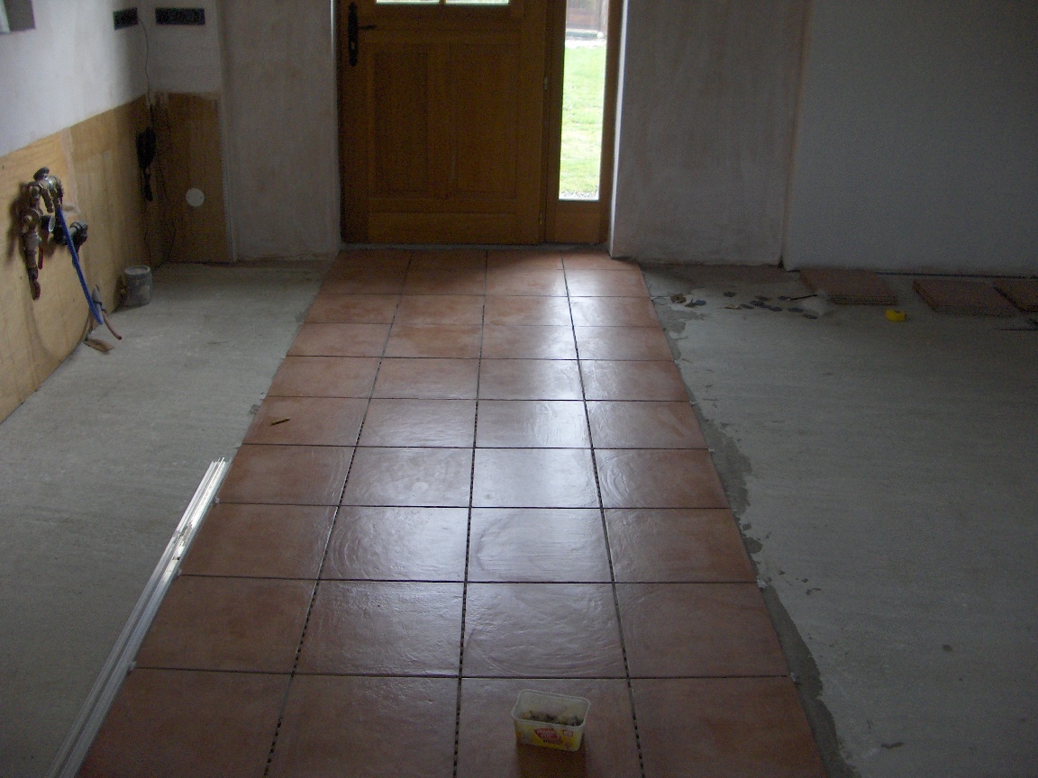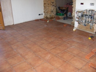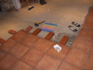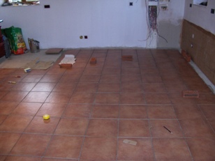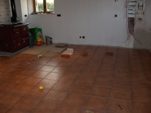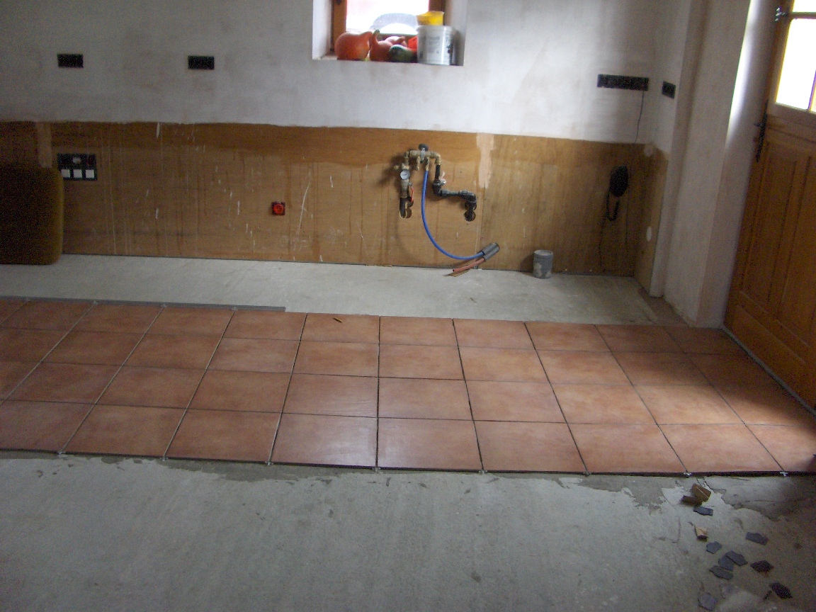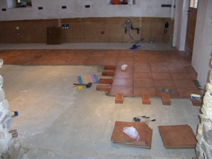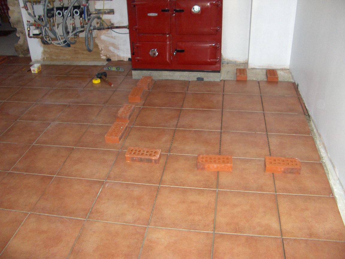 We did have a few sunny days so took the opportunity to mix up some lime mortar and lay stones in the last opening to be closed. Then yet more tiling, the concrete floor was first sealed using PVA then a straight edge was set out as a guide for the first row of tiles. We used some spare bricks from the fire place and chimney to support the tiles whilst the glue went off. We have used a 2mm thick sheet of stainless steel for a splash back behind the Rayburn. |